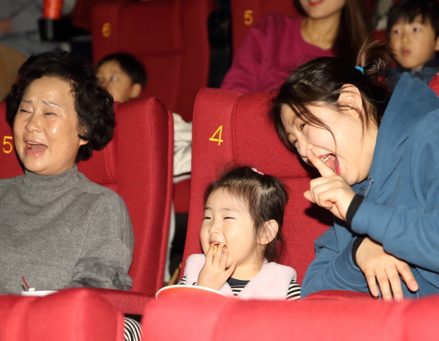 “우리 동네에도 영화관이 생겼어요”【경상포커스=임종구기자】29일 칠곡군 석적읍 칠곡호이영화관에서 홍호자(여·71세·석적읍)씨는 딸, 외손녀 등 3대가 함께 영화를 관람하며 활짝 웃고 있다.