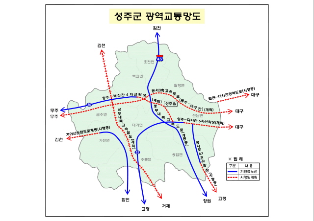 성주군에 따르면 2019년 국가기간사업으로 시행되는 남부내륙고속철도건설이 본격적으로 시행될 예정이고, 제5차 국도·국지도건설 5개년계획(2021~2025)에 성주~대구간 국도30호선 6차로확장(4,600억), 성주~벽진간 국도30호선 4차로확장(490억원), 국도59호선[가천구간]우회도로개설(320억원)사업을 국토교통부에 신청, 확정을 기다리고 있다.