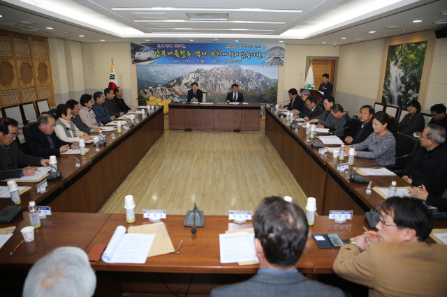 【경상포커스=전상철기자】11일 오후 5시, 성주군청 소회의실에서 성주군(군수 이병환)과 성주군의회(의장 구교강), 성주군사회단체협의회(회장 홍준명)가 한자리에 모여 남부내륙철도 성주역사(驛舍) 유치를 위한 간담회를 개최했다.