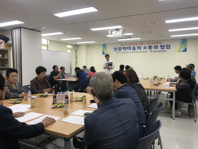 【경상포커스=전상철기자】고령군(군수 곽용환)은 21일 오후 2시 대가야문화누리 3층 취미교실에서 12개 인문학마을 리더, 고령군 마을평생교육지도자협의회 임원 및 지부장, 마을활동가 등 40여명이 참석한 가운데 ‘2019 고령군 인문학마을 만들기 사업’리더 대상 특강을 가졌다.