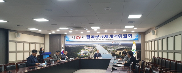 【경상포커스=배성호기자】칠곡군은 지난 26일 군청 회의실에서 강성익 부군수를 비롯해 규제개혁위원 7명이 참가한 가운데‘칠곡군 규제개혁위원회’를 개최했다.