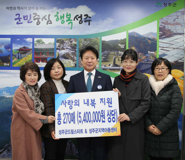 성주군 드림스타트팀은 관내 지역아동센터장 4명의 지난 1년간 노고를 치하하는 자리를 마련하고 드림스타트 및 지역아동센터 이용 아동들의 따뜻한 겨울나기에 보탬이 되는 사랑의 내복 증정식을 가졌다.