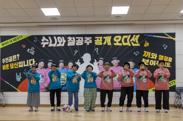 새 멤버로 선발된 이선화(77) 할머니와 수니와칠공주가 오디션의 대미를 장식하며 대표곡우리가 빠지면 랩이 아니지를 열창하고 있다. 환한 미소와 함께 박자를 맞추며 무대 위에서 자신감 넘치는 퍼포먼스를 선보이고 있다.(칠곡군 제공)