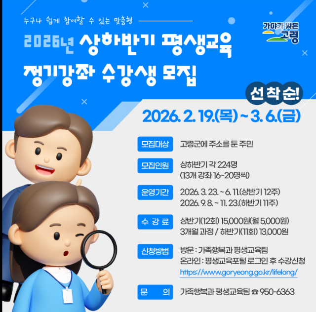 경상포커스=전상철기자고령군(군수 이남철)19일부터 36일까지 ‘2026년 상하반기 평생교육 정기강좌수강생 240명을 모집한다고 밝혔다.