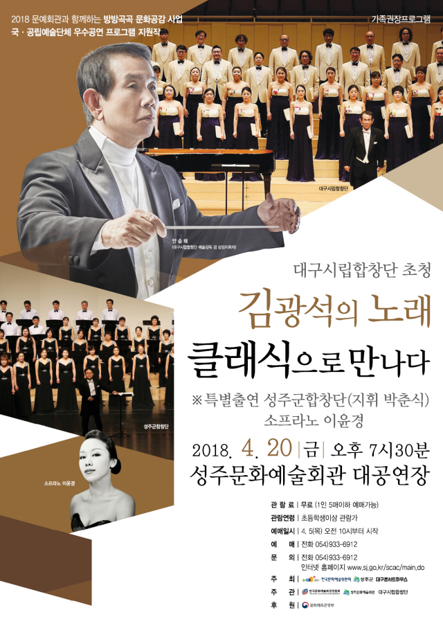 【경상포커스=전상철기자】성주군은 20일 오후 7시 30분 문화예술회관 대공연장에서 대구시립합창단 초청“김광석의 노래, 클래식으로 만나다” 를 무료로 공연한다.