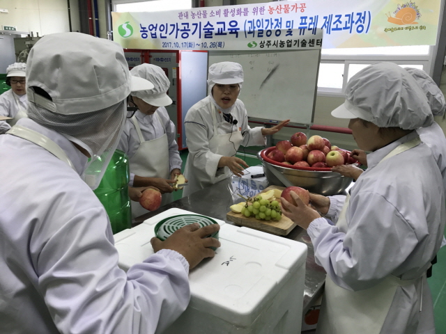 【경상포커스=김경희 기자】상주시농업기술센터는 2017년 농업인가공기술교육의 일환으로 실시되는 지역 과실류를 활용한 과일강정 및 퓨레 제조과정을 지난 17일부터 26일까지 매주 화, 목요일 4회 16시간 과정으로 실시되고 있다.