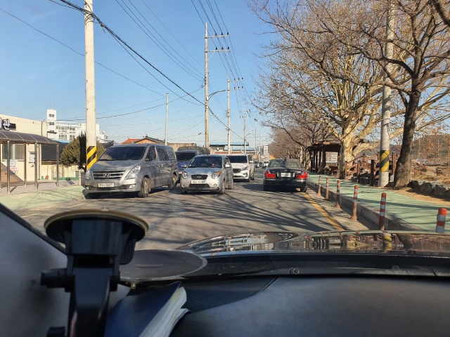 지난 27일 시장 뒤편 왕복 1차선 도로. 노점상들의 차량은 물론 시장 고객들의 차량까지 불법 주정차된 채 도로를 점령하면서 차량들은 가다서다를 반복하고 양쪽 통행이 불가능하다보니 중앙선을 넘어 곡예운전을 하는 실정이다.