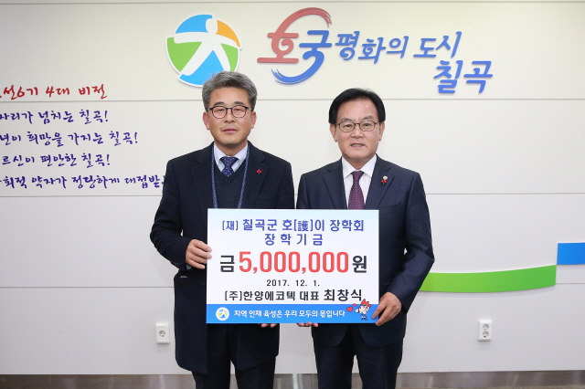 ㈜한양에코텍 최창식 대표는 지역인재육성과 교육발전을 위해 써달라며 (재)칠곡군호이장학회에 호이장학금 500만원을 기탁했다.고 3일 밝혔다.